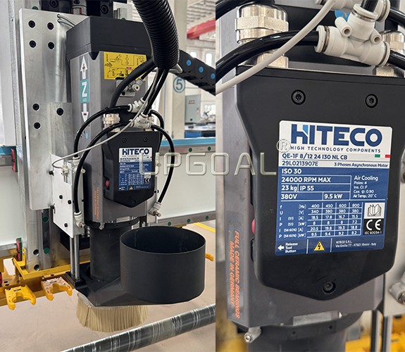3.Adopted with famous Italy HITECO 9.5KW air cooling ATC spindle, high precision, low noise, high RPM, long life time , and stable moving.